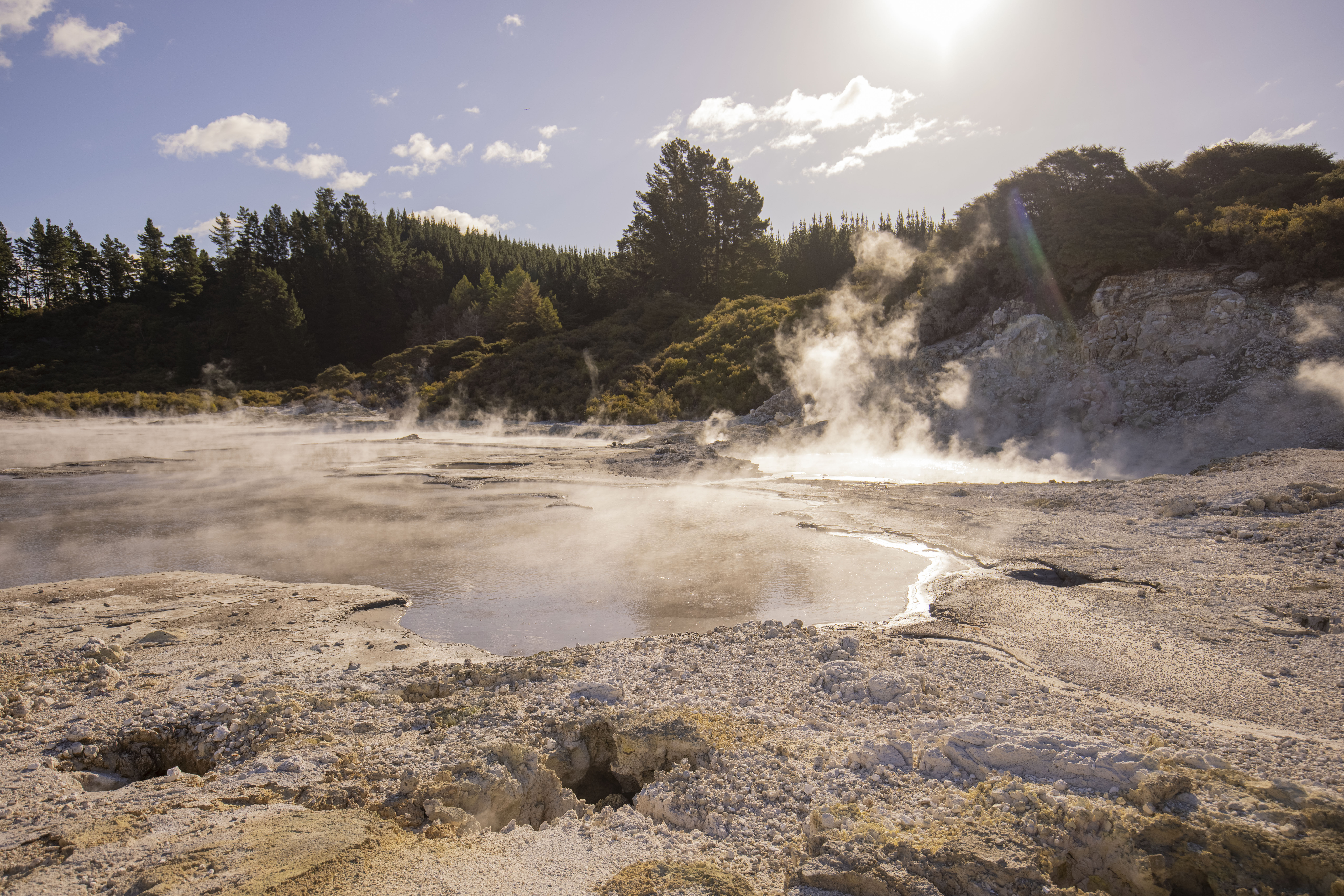 The Hell's Gate Experience: Continue your journey with a 1-hour drive to Hell's Gate (via State Hwy 5 and State Hwy 30) for a unique geothermal adventure. Participate in either a guided or self-guided interactive geothermal walk exploring boiling hot pools, steaming fumaroles, and bubbling mud pools. Enjoy the therapeutic properties of the geothermal mud baths, known for their skin-cleansing and exfoliating benefits (20 minutes per session). Relax in the sulphur spas, rich in minerals that promote healing and relaxation. Children aged 12 and over can engage in traditional Māori carving, offering insight into local artistry and heritage. Finish your experience with a refreshing dip in the cool plunge pool. Afterward, travel to the Rotorua District for a lunch break at Arawa St, where you have a wide choice of dining options. Conclude your day with a stop at Mercer for a 15-minute break to enjoy the scenic beauty of the Waikato River before returning to Auckland CBD, arriving back at your hotel around 6:00 PM.